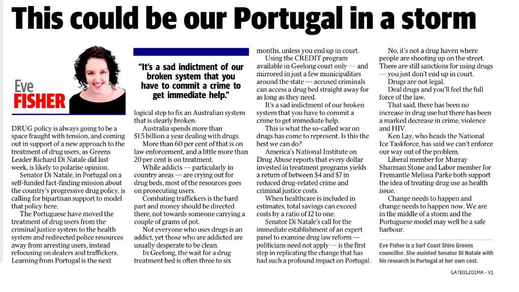 I’ve just spent time in Portugal and Switzerland researching drug decriminalisation. I was lucky to tag along with Australian Greens Leader Senator Richard Di Natale on his quest to discover approaching to drug treatment abroad. I wrote this opinion piece for the Geelong Advertiser.