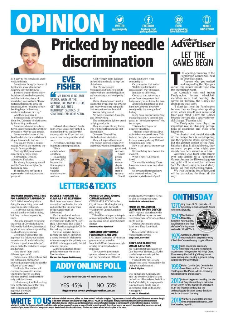 Hi Eve, congratulations on your article. It’s refreshing to see that someone in the mainstream media is brave enough to say what many are feeling. As a health professional, I have extreme pressure from my employer, my colleagues and the wider community to accept “the jab” even though I have genuine concerns about it’s safety and efficacy. I have been totally discouraged from asking any questions or having any autonomy to decline this vaccine. I am basically being told “no jab, no job”.